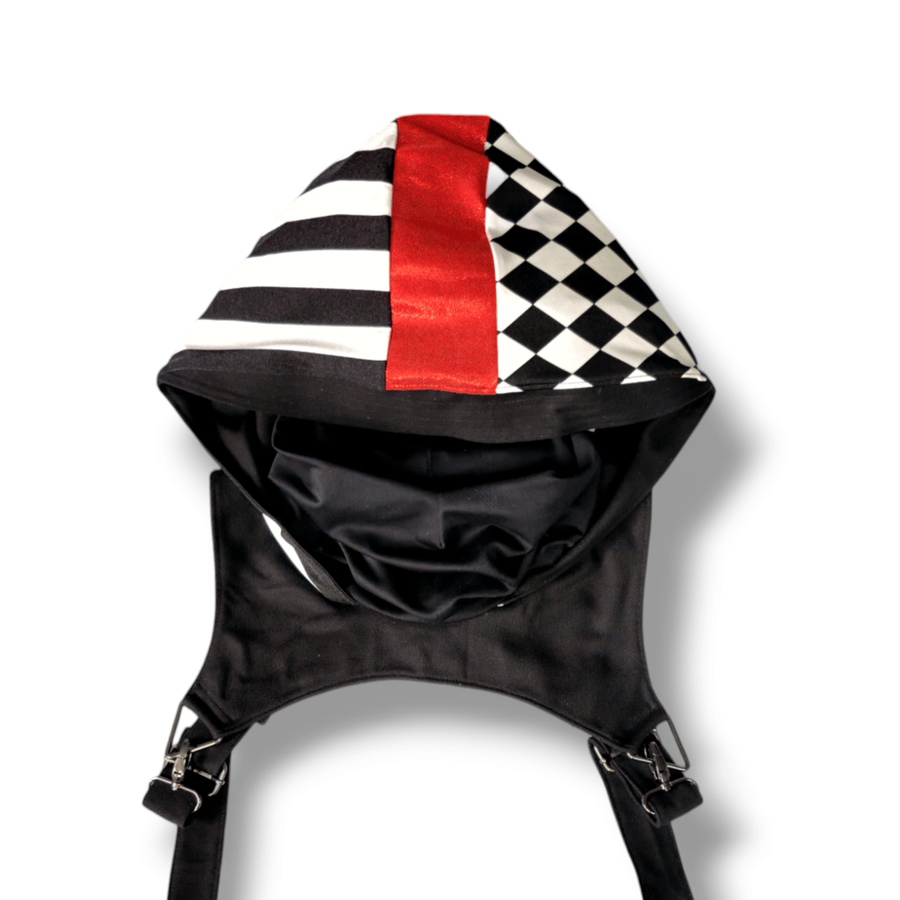 Our Ninja Hoods are the perfect combination of style, versatility, and FUNction. Handmade to order, these hoods feature size-adjustable straps under the arms, ensuring a comfortable and flexible fit for any body type. Whether you're rocking it at a festival or adding a unique edge to your everyday look, the Ninja Hood is designed to help you stand out.