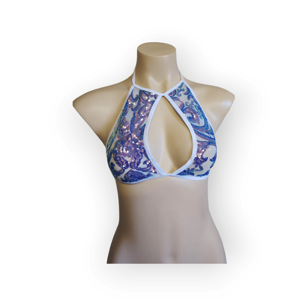 Add a touch of glam with our stunning sequin halter top, designed with a chic keyhole cutout on the chest for a bold yet flattering look. The sequin fabric catches the light beautifully, making it the ideal piece for festivals, performances, or nights out.