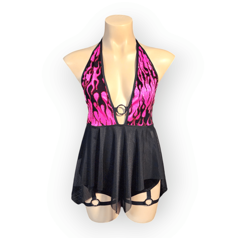A stunning blend of bold design and playful charm. This halter-tie bodysuit features a flattering scrunched butt with comfortable yet cheeky bum coverage, accented by delicate garters with matte black O-ring details. Adding an extra layer of magic, the bodysuit has a soft mesh fairy skirt that provides comfort, a touch of coverage, and an irresistibly cute vibe!