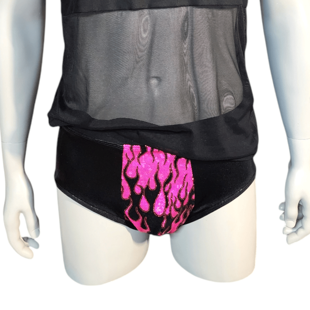 Designed for bold comfort and a touch of fiery flair. These masculine briefs combine the shimmer of black sparkleflex fabric with a striking UV flame fabric accent across the front, ensuring you stand out in all the right ways.