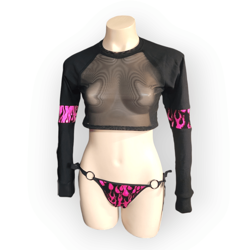 This unique design combines soft sweater material for the sleeves with a striking stripe of pink flame fabric on each arm, adding a bold and fiery touch. The mesh body brings an edgy, breathable vibe that’s perfect for layering or making a statement on its own.