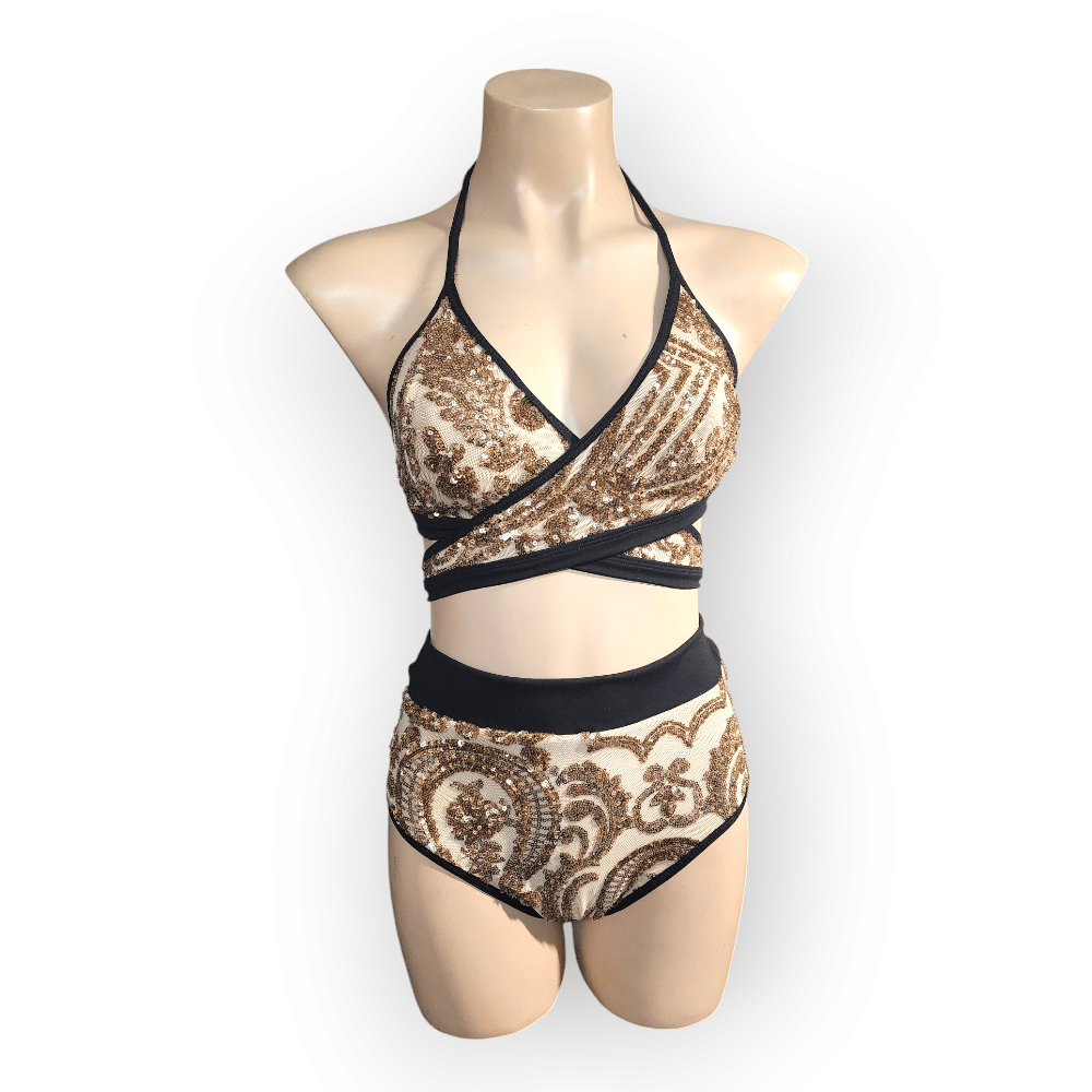 The wrap-style neckline highlights your shape, while the supportive band ensures comfort and style. Perfect for making a statement—whether on the dance floor or center stage.